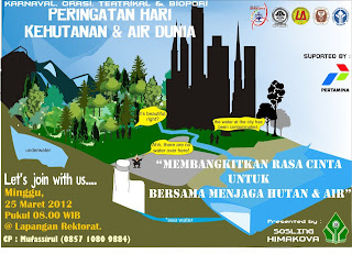 Ayo ikuti Peringatan Hari Kehutanan dan Air Dunia. Minggu 25, Maret 2012 pukul 08.00 @ Lap. Rektorat. Ada Kanaval, Orasi, Teatrikal, dan Pembuatan lubang serap Biopori. SAVE OUR FOREST AND WATER FOR THE BETTER FUTURE… ^^