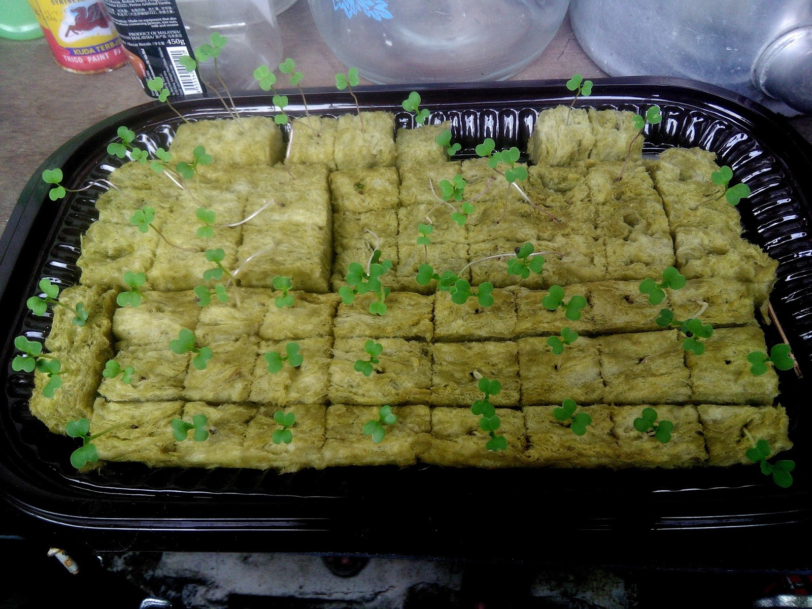 6. Kontrol persemaian setiap hari, jangan sampai rockwool kering. Siram pakai semprotan biar enak. Gak usah sampe kerendam, yang penting basah aja.
